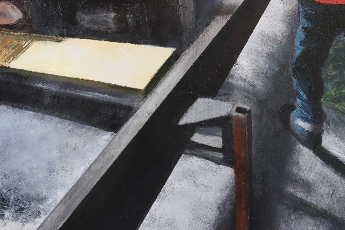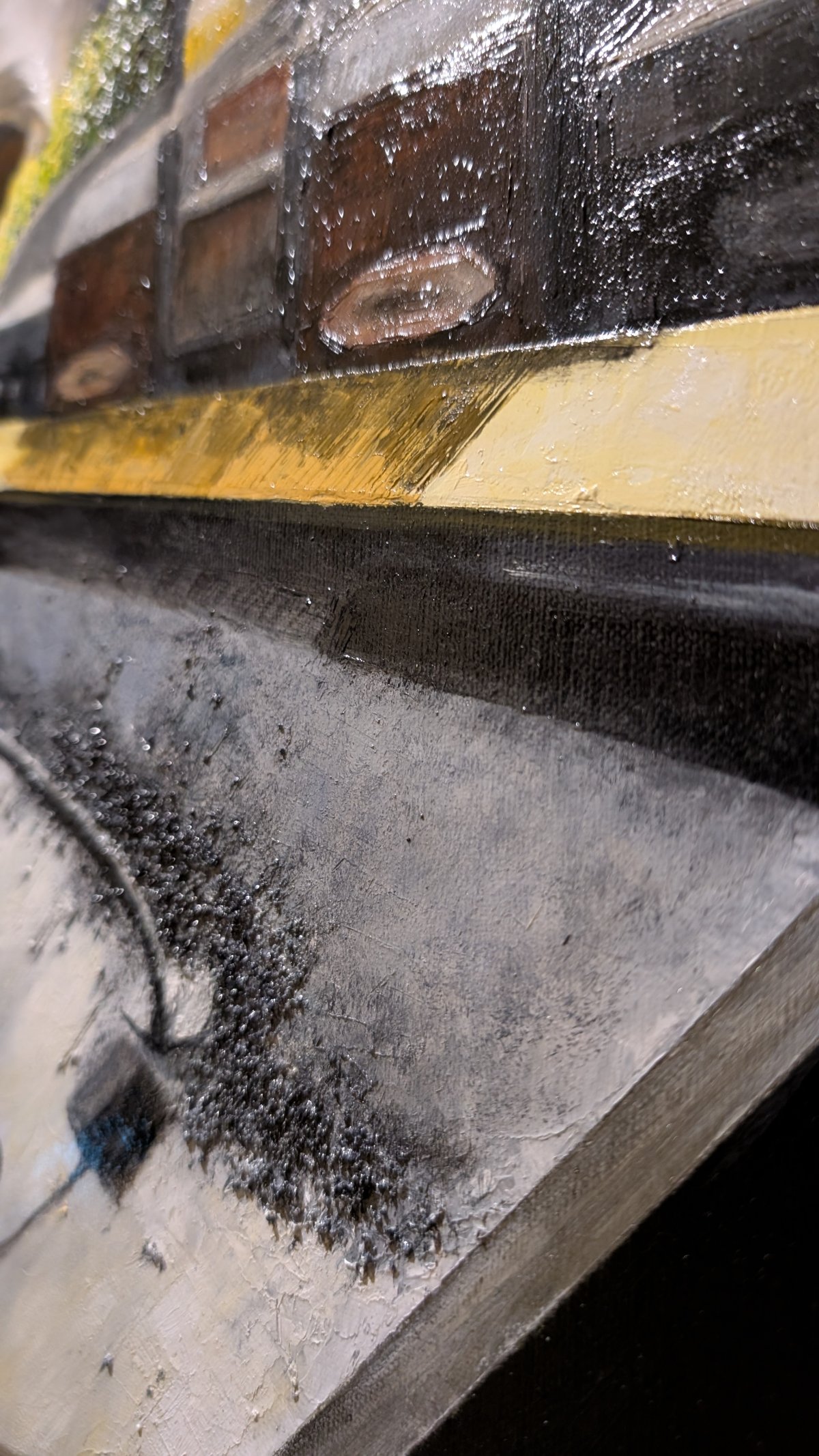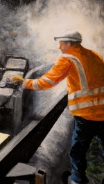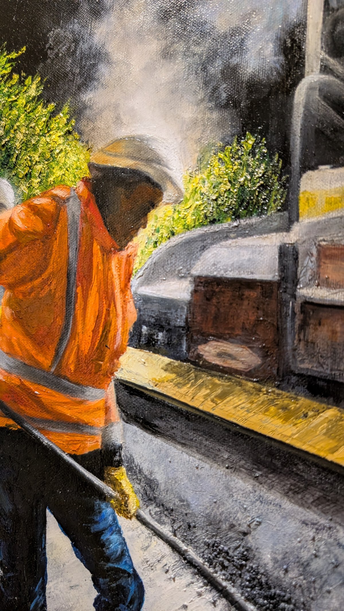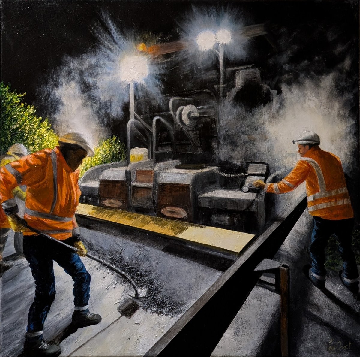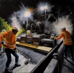 L’acrylique est utilisée pour les parties métalliques afin d’apporter de la brillance. Le reste est réalisé à l’huile. Ce qui m’intéressait était le travail sur les ombres et les lumières ainsi que les volutes de fumées issues de la chaleur du bitume.