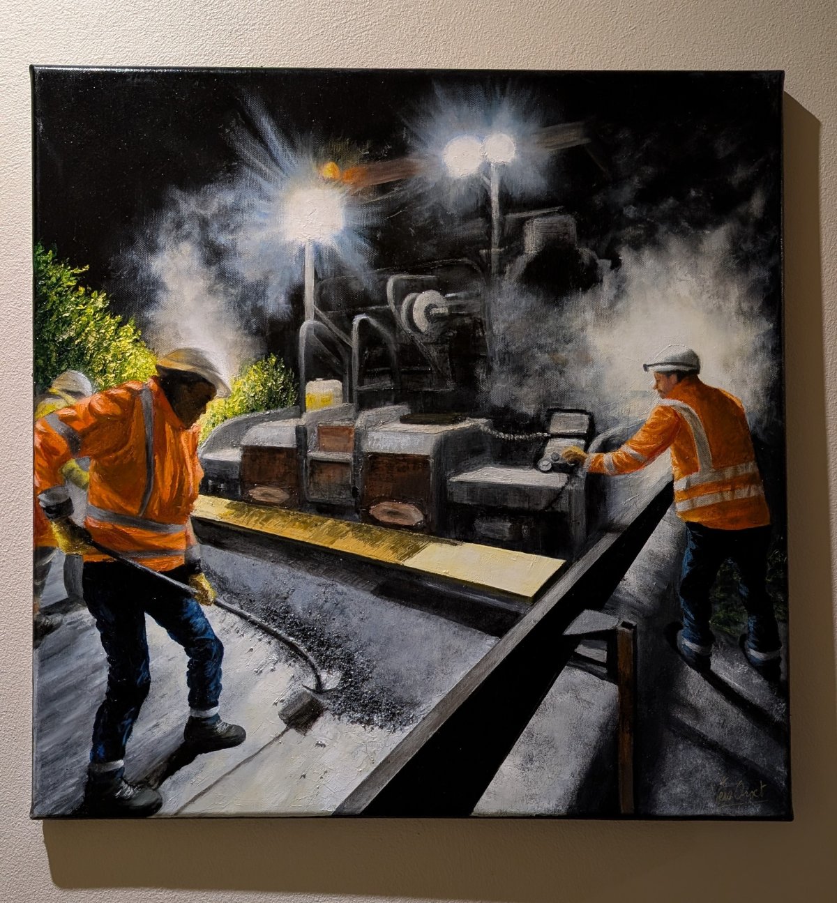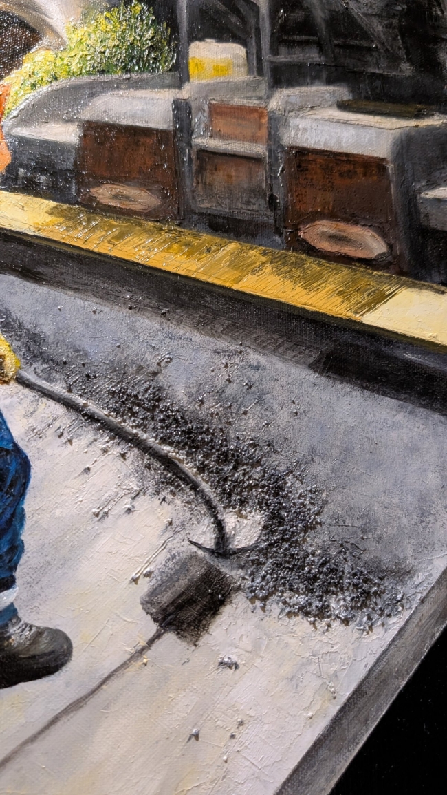 Ce tableau a été inspiré d’une photo de chantier de chaussées. (Photo libre de droits) que j’ai zoomée et réinterprétée.