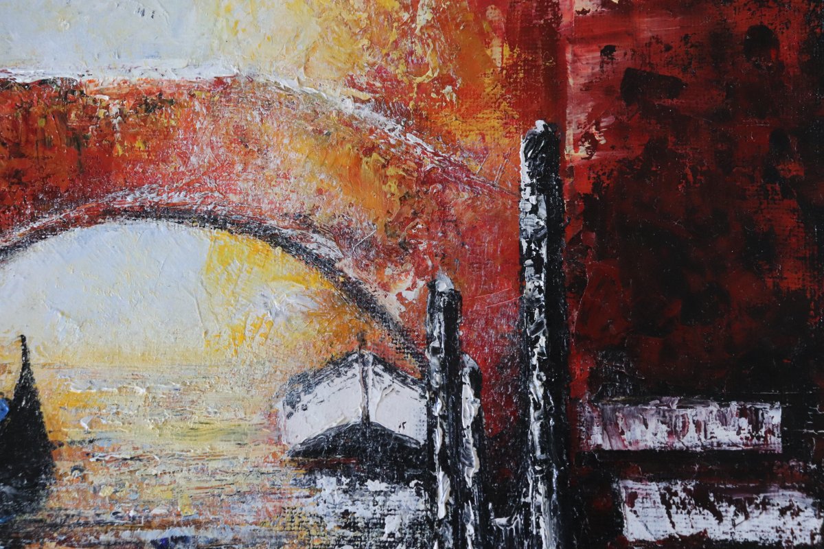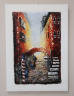 Ce tableau a été réalisé à ma libre interprétation pour les couleurs. Il représente Venise avec ses gondoles, ses canaux ses reflets etc…,