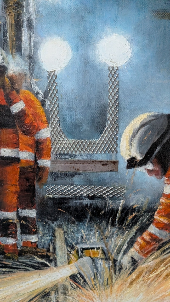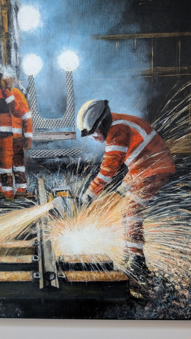 La peinture acrylique est utilisée pour les parties métalliques afin d’apporter de la brillance. Des pièces métalliques ont été vernies et collées sur la toile. Le reste est réalisé à l’huile. Les contrastes sont sublimés avec cette lumière issue des étincelles de la soudure. Le ballast est en relief avec des épaisseurs de peinture à l’huile.