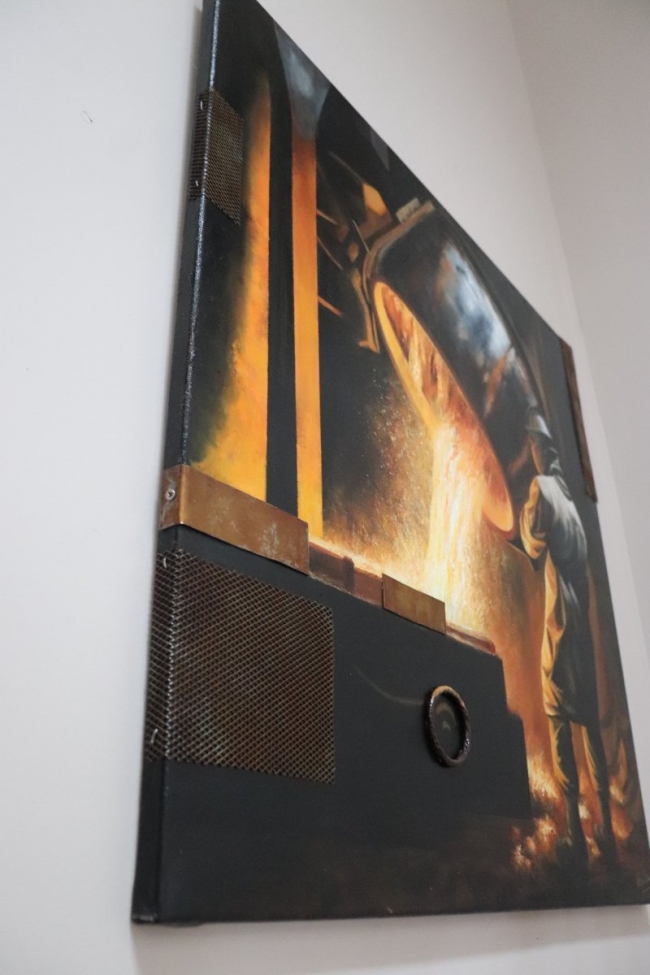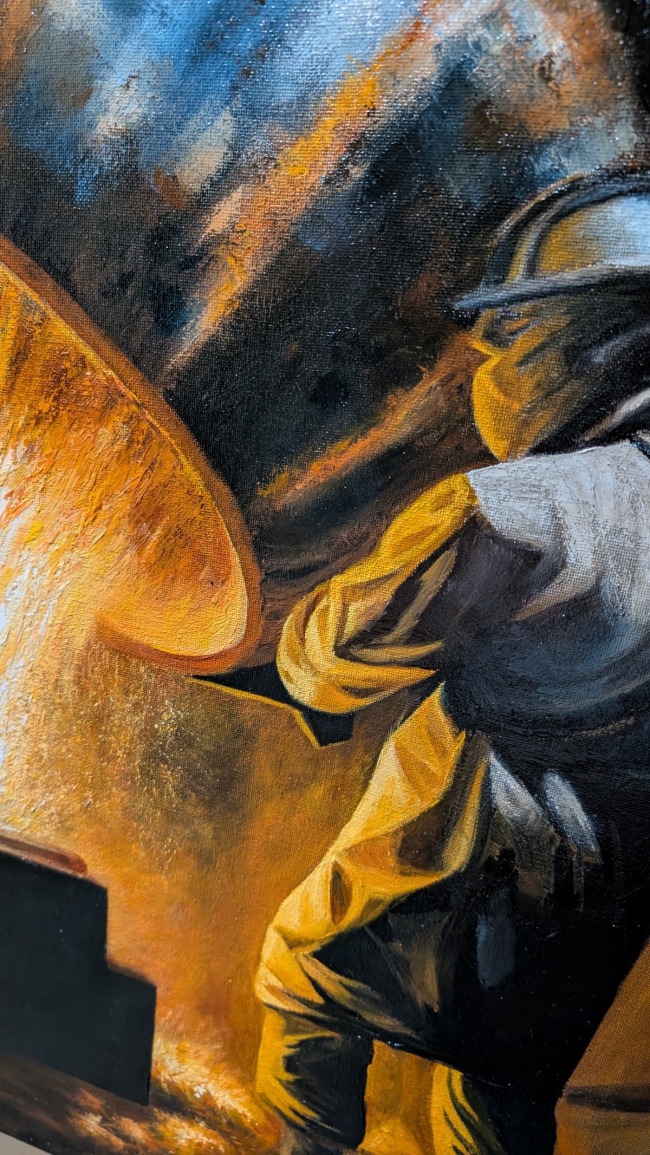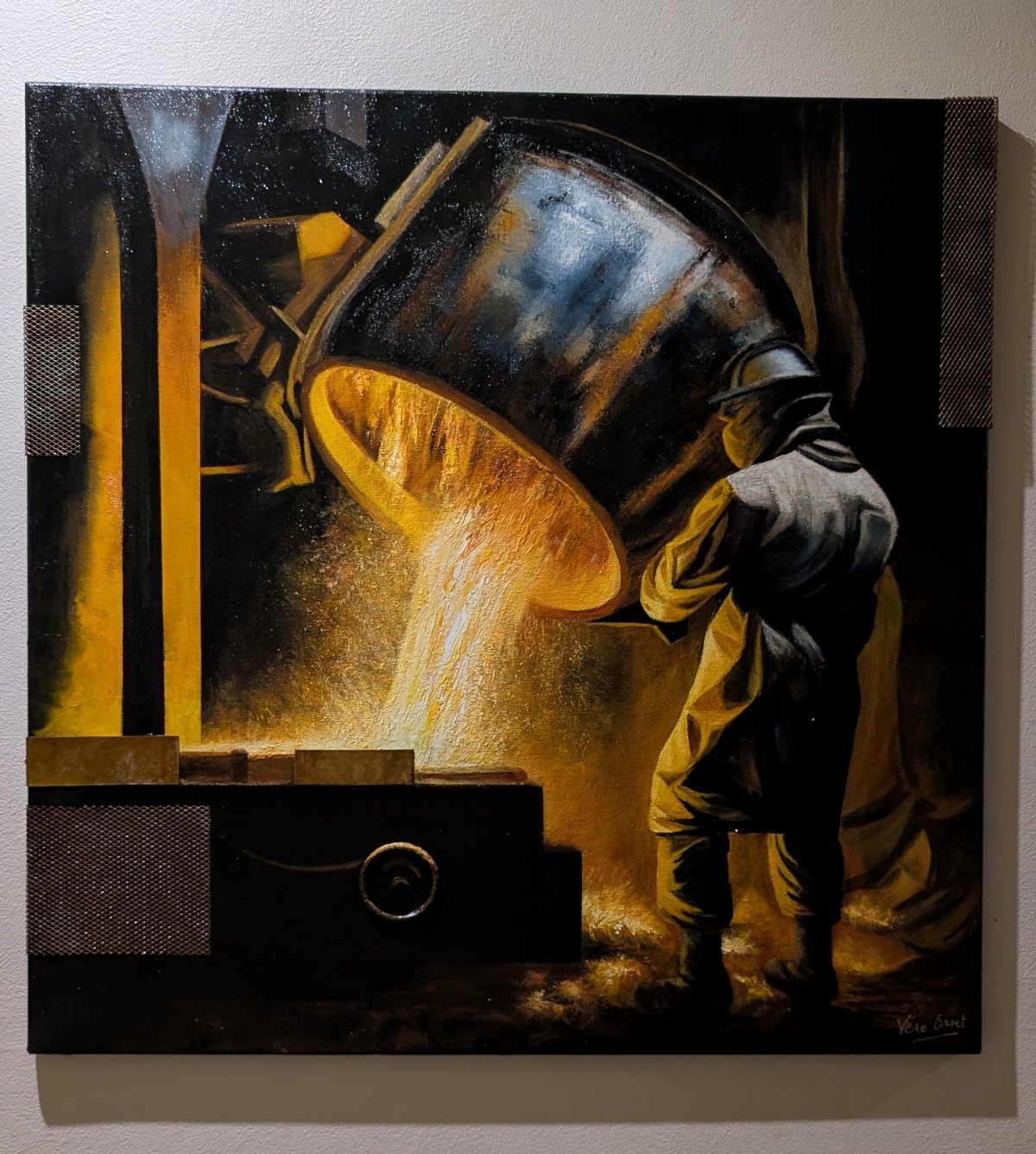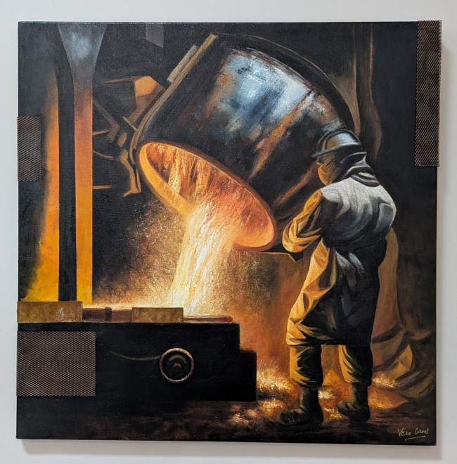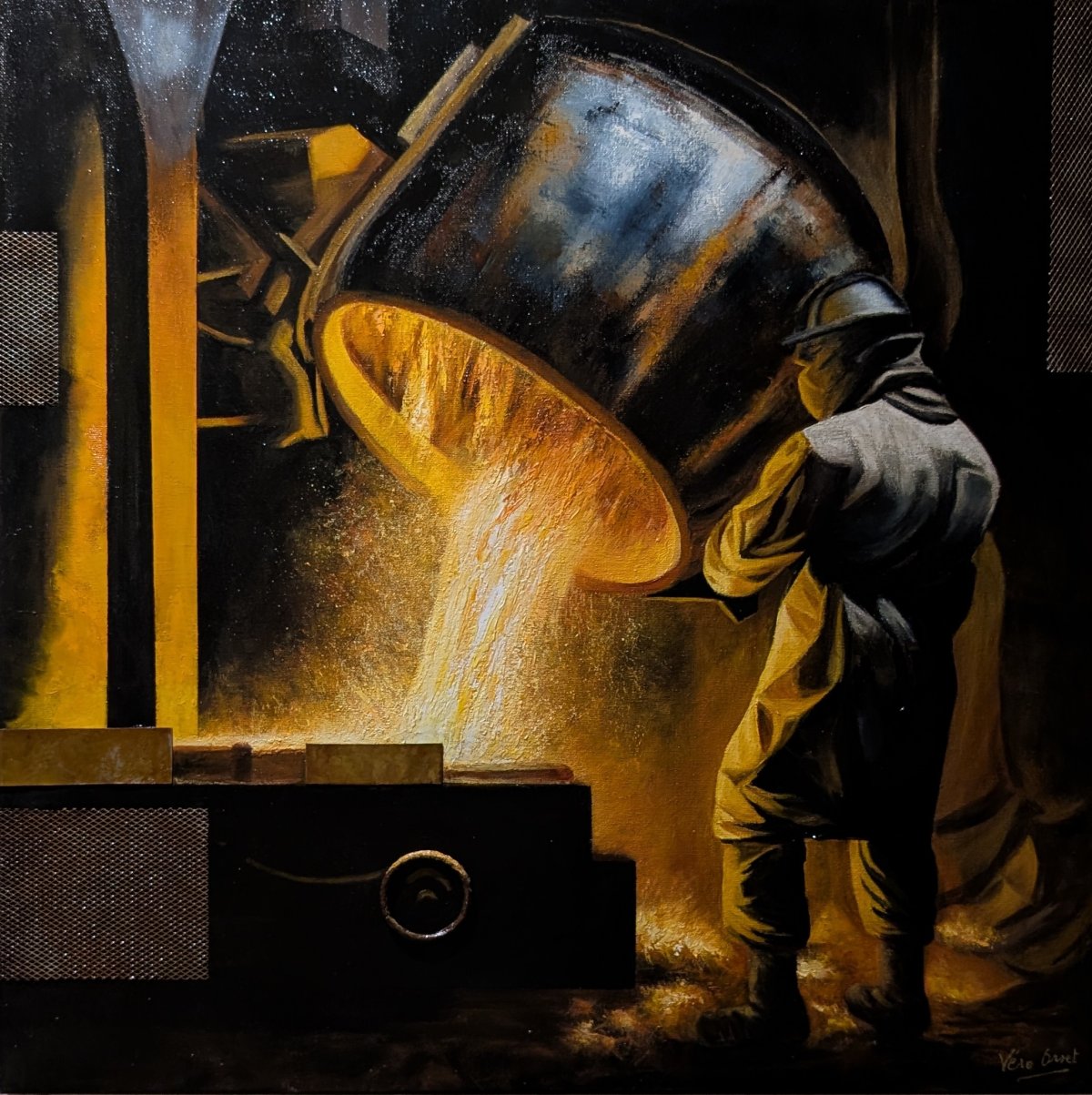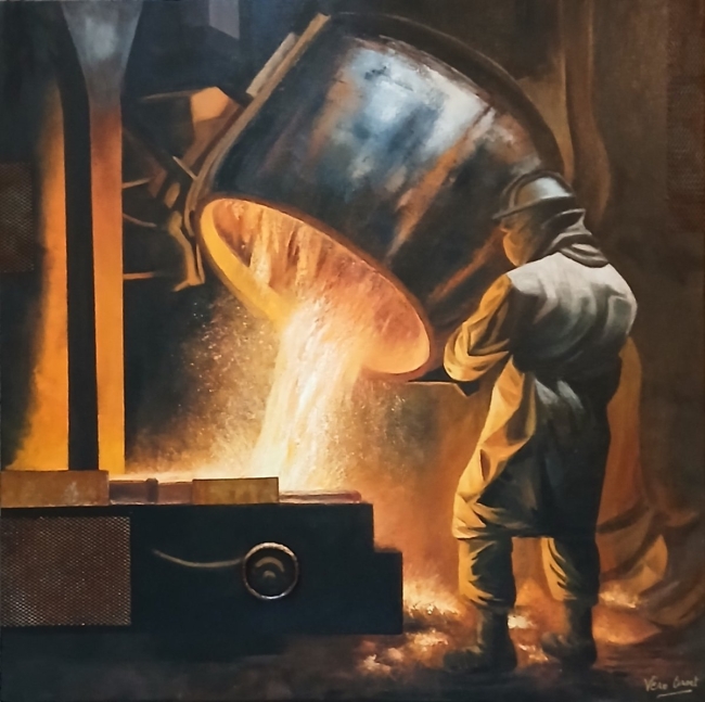 Je me suis inspirée des techniques des grands meîtres du clair obscur pour ce tableau avec des jeux de formes et de lumières. Les contrastes sont à l'honneur avec l'acier en fusion éclairé sur fond sombre et l'ouvrier en foncé sur fond éclairé. On retrouve des triangles, losanges et élipses dans le tableaux avec des rappels. Le nombre d'or (1,618) y figure à plusieurs reprises pour apporter une composition esthétique. Notre oeil se déplace, guidé par ces formes et jeux de lumières...