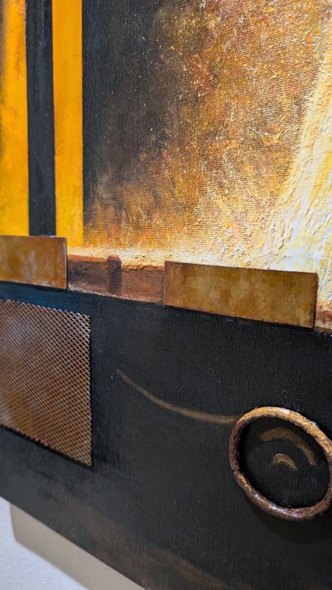 Ces pièces de métal accentuent l'effet industriel et apportent une touche d'originalité ainsi que du volume. Elles font partie de la composition. Je les découpe moi-même sur mesure et les plient.