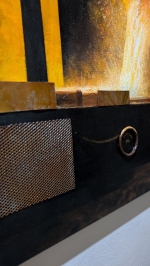 Entièrement réalisé à l’huile, majoritairement aux pinceaux. Certaines parties sont faites au couteau comme la coulure, afin d’apporter de l’épaisseur. J’ai ajouté 6 pièces de métal (acier rouillé) collés et visés sur les bords du tableau. Ces pièces ont été rouillées puis vernies (verni spécial acier) pour arrêter la rouille.