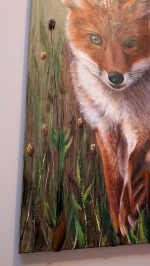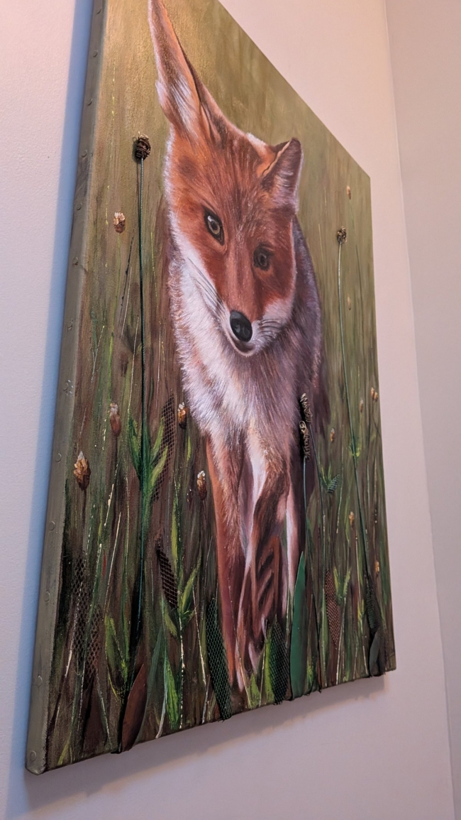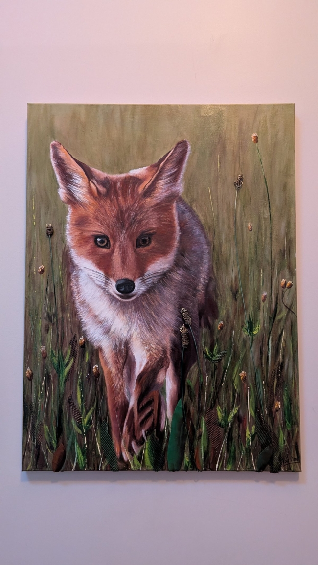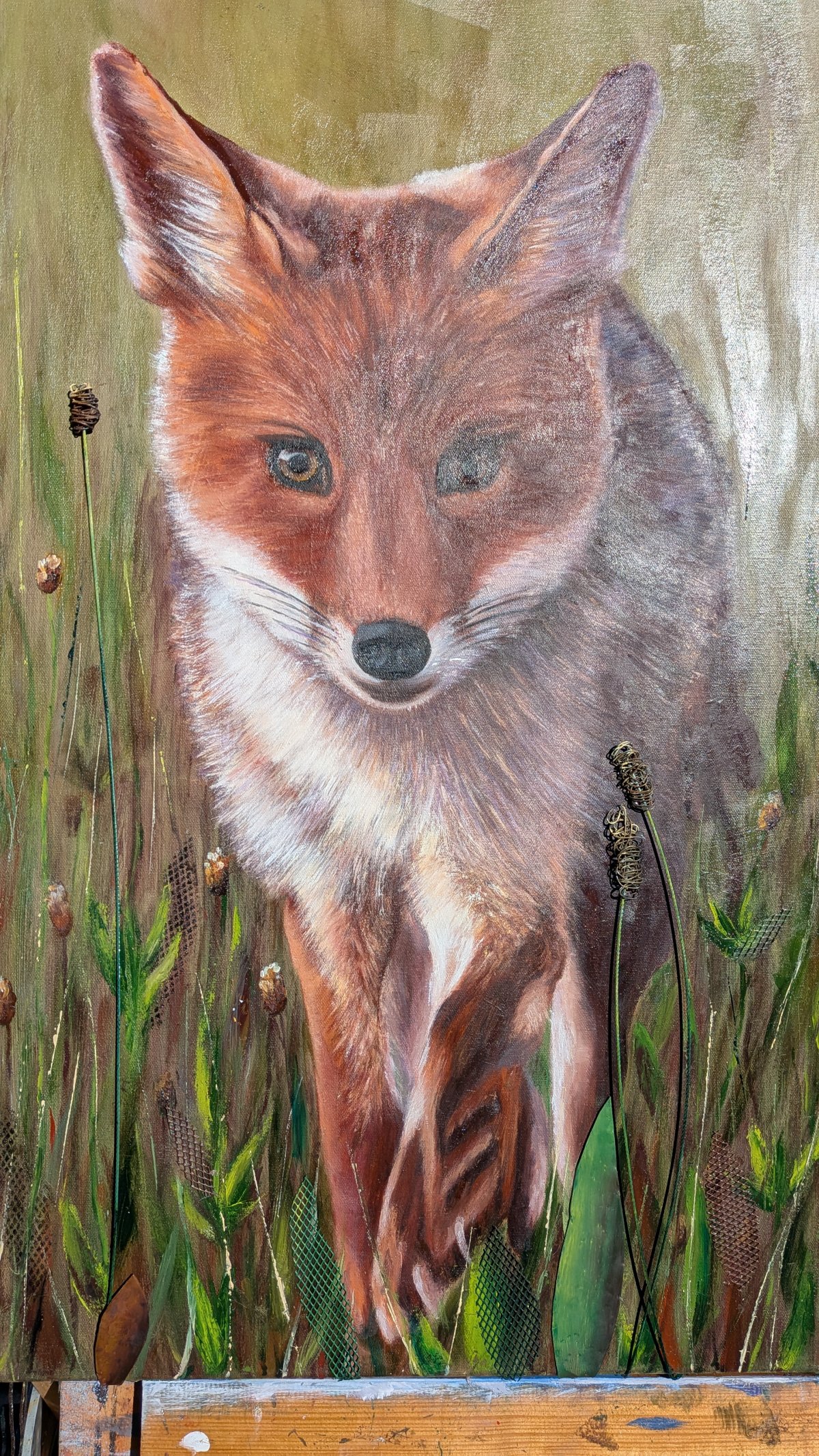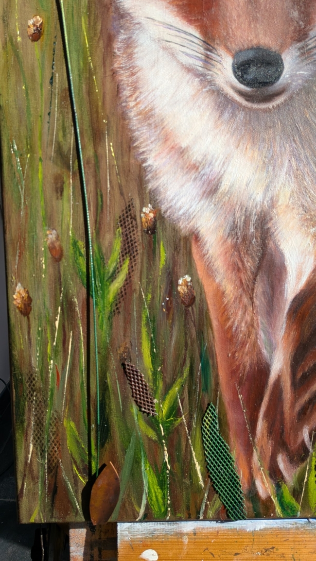 Une partie des herbes sont réalisées en métal et fils de fer. Elles sont fixées et collées à la toile.En effet, l'ajout de pièces métalliques, initié sur la série Chantiers en scène, a beaucoup plu. Je décline à présent cette approche matière à mes autres thème. Sur le renard, ces herbes symbolisent l'impact des humains sur la liberté des animaux sauvages et sur la nature en général. En métal, ces herbes apportent un relief, un effet de matières et une oeuvre unique. Ces ajouts de métal subliment ce tableau. Les pièces métalliques sont soit peintes à la bombe avec une peinture spéciale métals, soit rouillées et vernies.