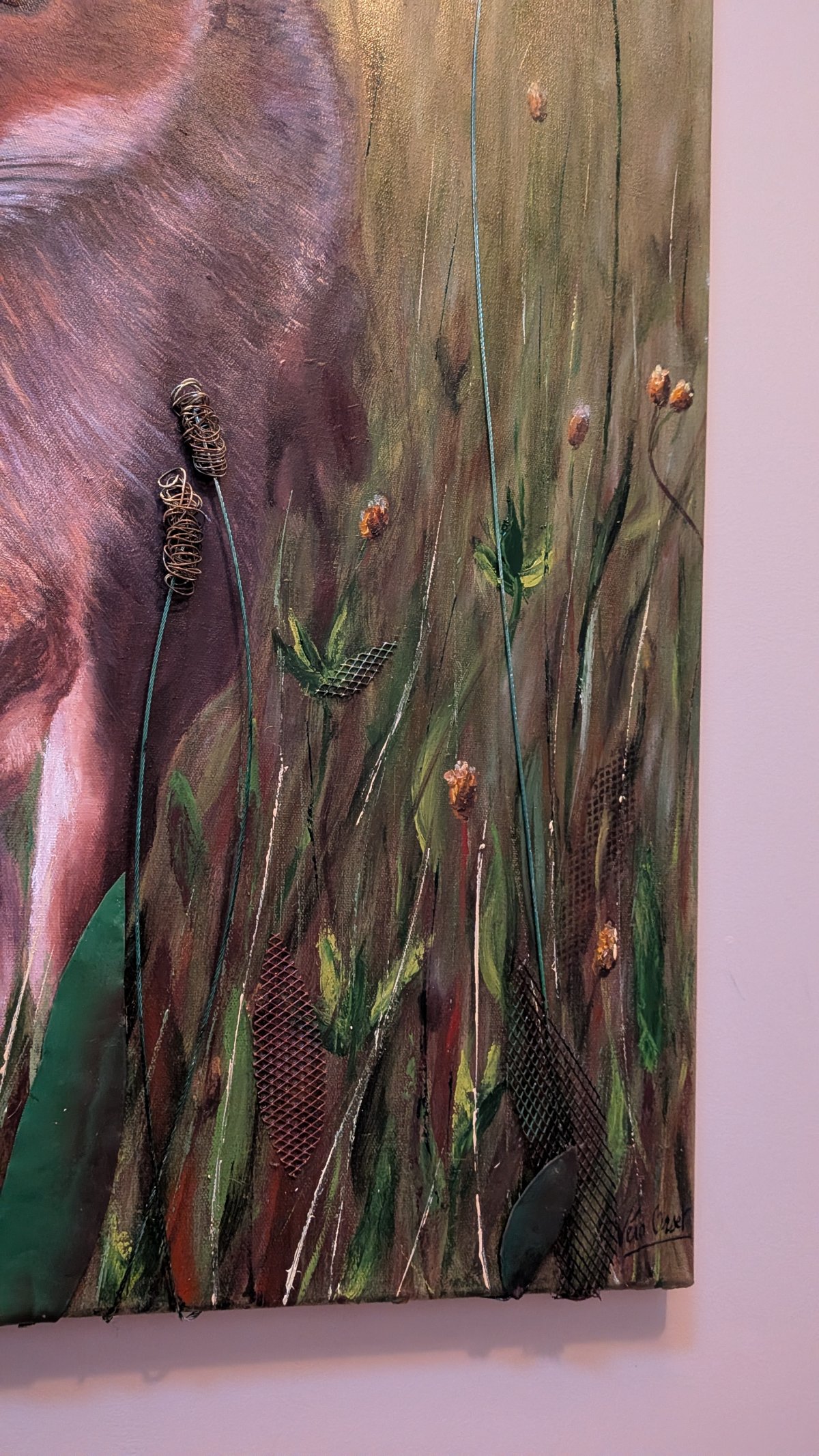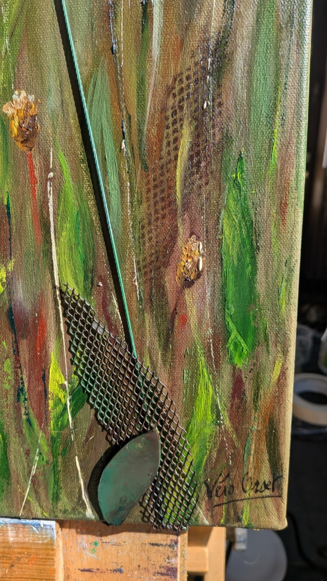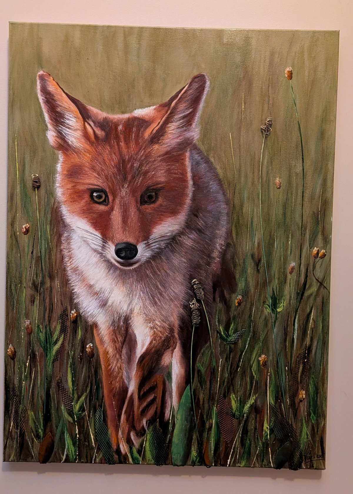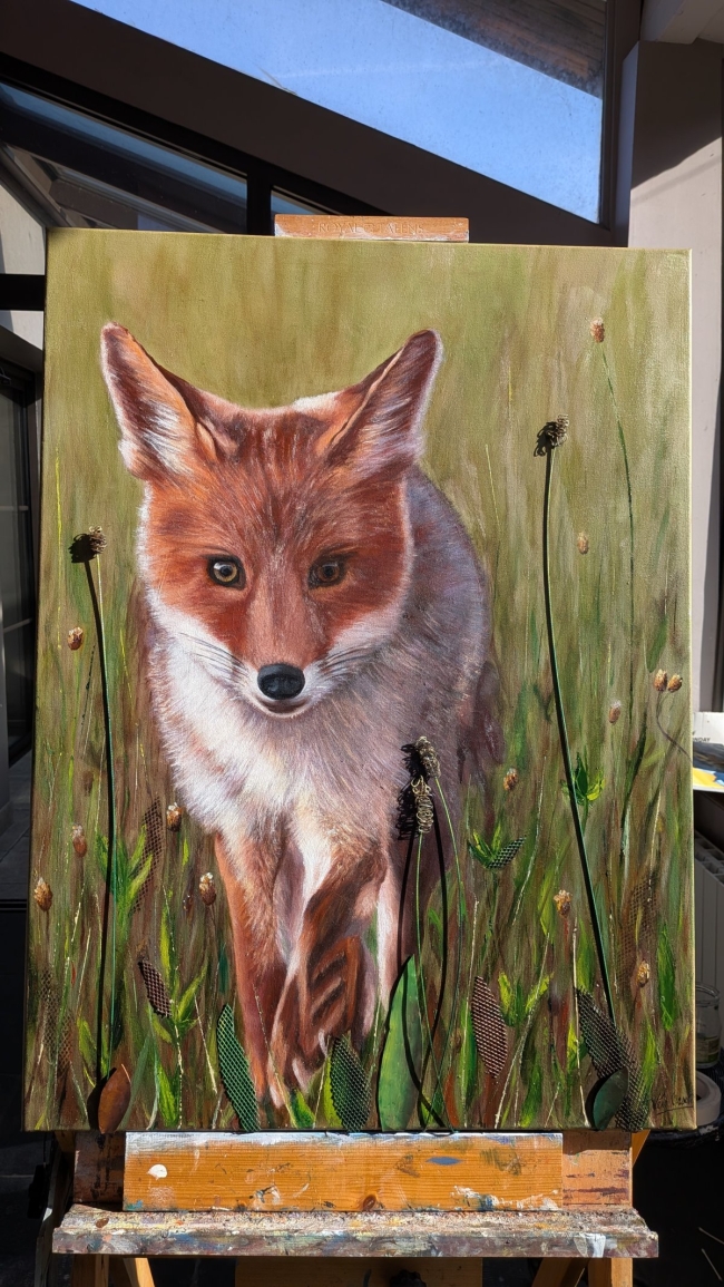 Une partie des herbes sont réalisées en métal et fils de fer. Elles sont fixées et collées à la toile.En effet, l'ajout de pièces métalliques, initié sur la série Chantiers en scène, a beaucoup plu. Je décline à présent cette approche matière à mes autres thème. Sur le renard, ces herbes symbolisent l'impact des humains sur la liberté des animaux sauvages et sur la nature en général. En métal, ces herbes apportent un relief, un effet de matières et une oeuvre unique. Ces ajouts de métal subliment ce tableau. Les pièces métalliques sont soit peintes à la bombe avec une peinture spéciale métals, soit rouillées et vernies.