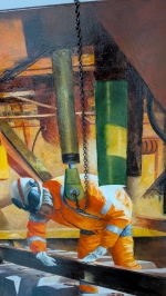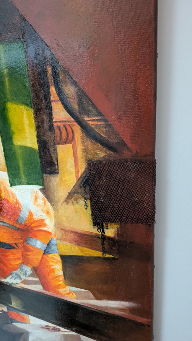Il est entièrement réalisé à l'huile puis verni. J'ai intégré des éléments métalliques découpés, rouillés et vernis, en relief, qui sont fixés sur ma toile afin de renforcer l'aspect industriel. Il y a même une chaine peinte et vernie. Les éléments métalliques sont vernis avec un produit adapté aux métaux pour stoper la rouille.