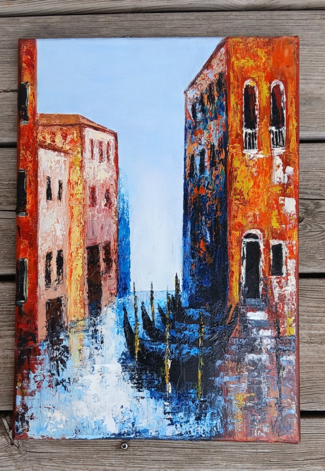 Ce tableau a été réalisé à ma libre interprétation pour les couleurs. Il représente Venise avec ses gondoles, ses canaux ses reflets etc…,
