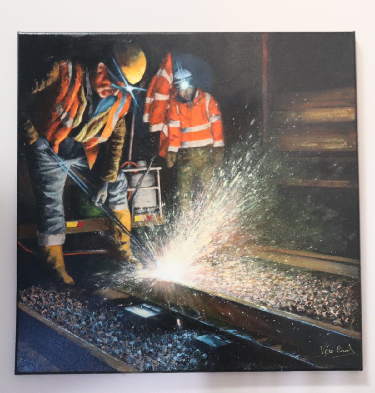 Ce tableau a été inspiré d’une photo de chantier sur la modernisation de la ligne entre Paris et Never Atelier soudure. Photo libre de droits.