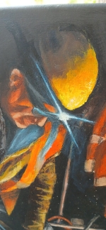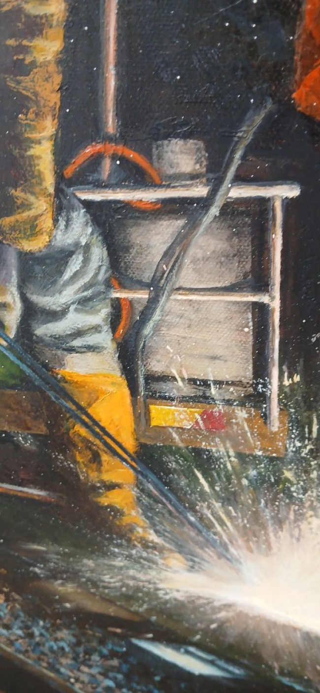 L’acrylique est utilisée pour les parties métalliques afin d’apporter de la brillance. Le reste est réalisé à l’huile. Les contrastes sont sublimés avec cette lumière issue des étincelles de la soudure. Le ballast est en relief avec des épaisseurs de peinture à l’huile.